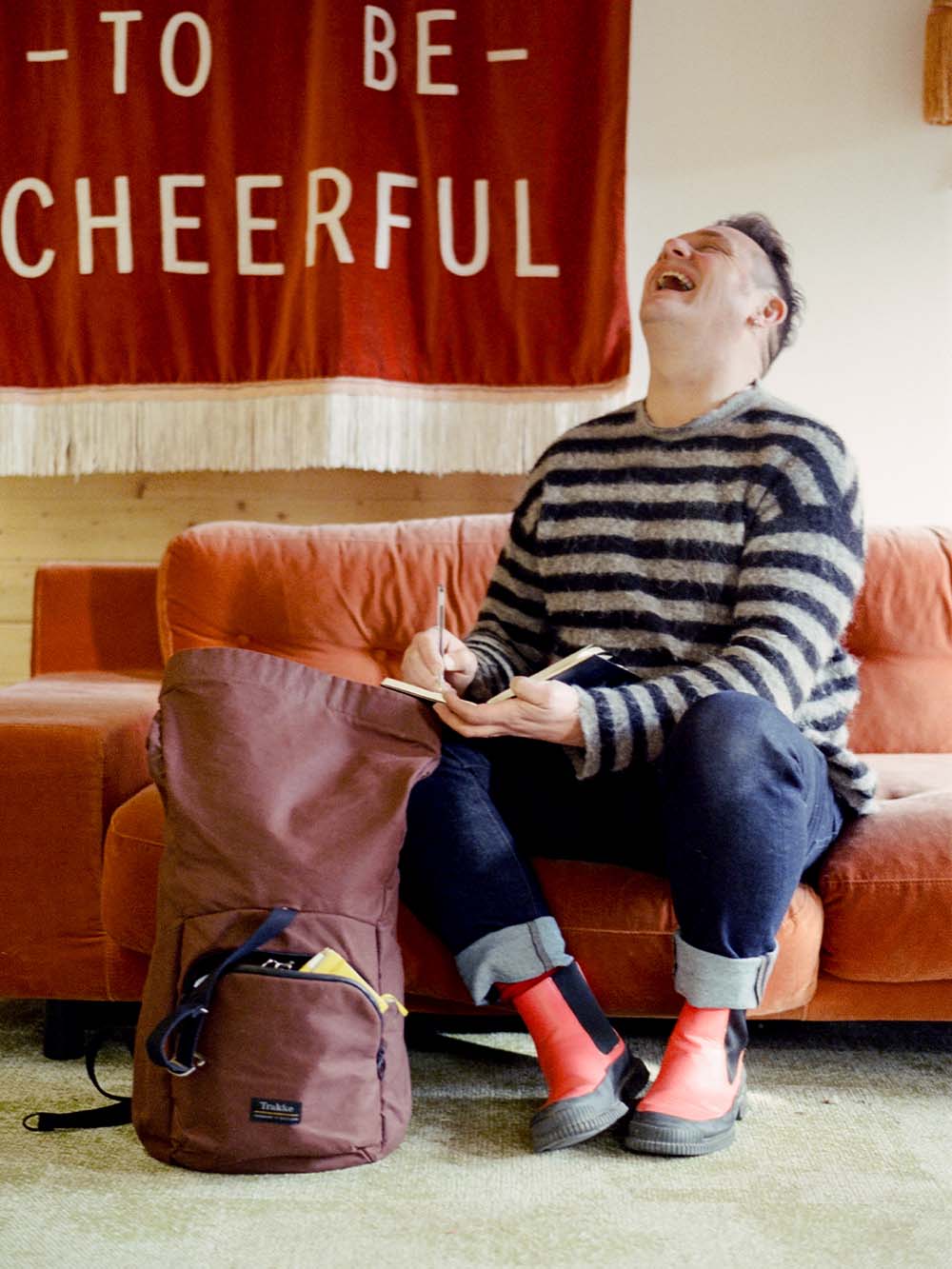I have a small messenger bag - which if I'm travelling to London and I don't wanna carry much stuff with me - has my iPad, keys for my bike and a battery to charge everything. Occasionally I carry a burrito roll of clothing, which I only discovered because of Trakke. I watched Alec roll his clothing into a burrito — t-shirt, pants, socks — using the socks to wrap around the edge and to pull it all in. I have never packed anything else any other way since I saw it. So I owe Alec a massive thank you for that.